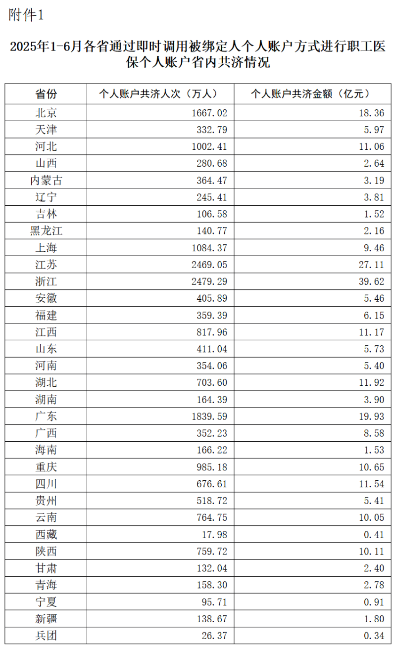 2025年1-6月,通过即时调用被绑定人个人账户方式进行职工医保个人账户省内共济的人次2.00亿,共济金额261.07亿元。